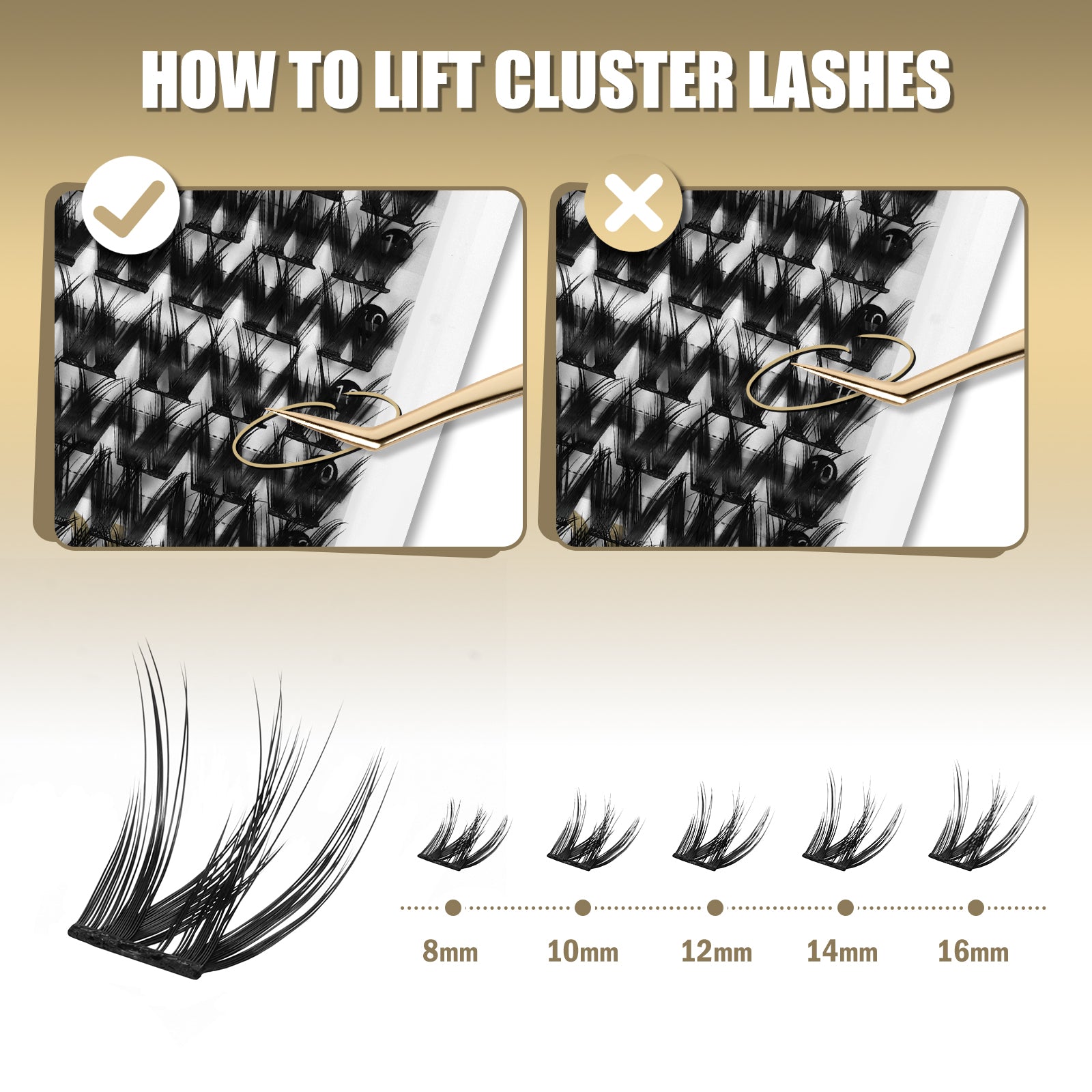 Setup: Curl up your natural lashes with eyelash curler. Pinch the lash cluster with your fingers and carefully take it off the tray.